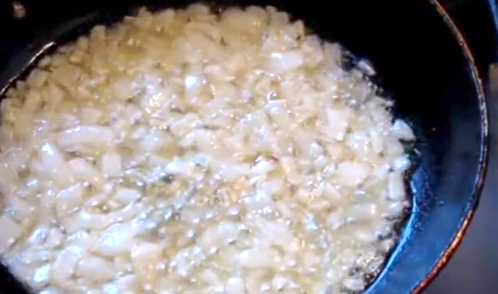 Garnitures de cuisson. Hachez finement l'oignon et faites-le frire dans une casserole avec de l'huile végétale chauffée.
