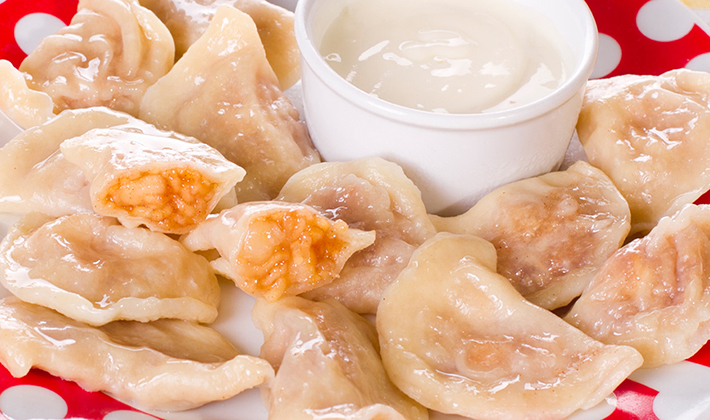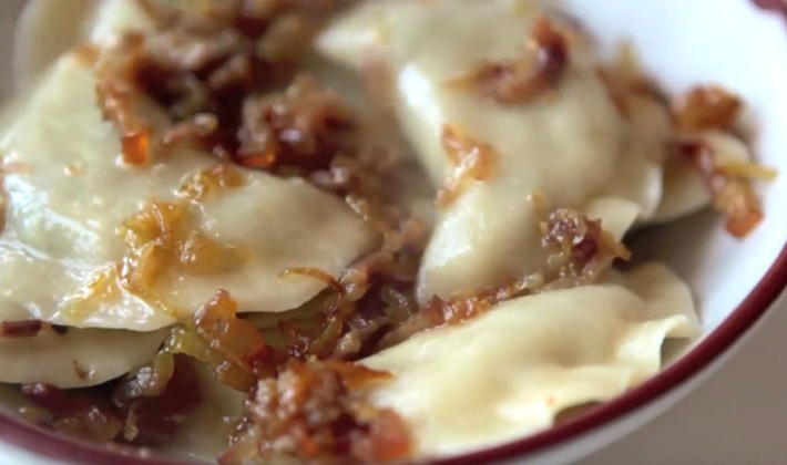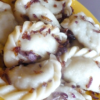 Pour cuire des boulettes de pâte avec des poitrines et des pommes de terre salées, 1/10 de la farine infuse 1/3 de l'eau bouillante sur la quantité totale d'eau. Mélangez la farine infusée, ajoutez le reste de la farine et de l’eau à la température ambiante, salez, ajoutez les œufs et pétrissez la pâte pour qu’elle soit uniforme et élastique. Laisser reposer pendant 40 minutes. Passer les pommes de terre bouillies dans un hachoir à viande, mélanger avec des oignons émincés finement hachés, des champignons bouillis hachés, du sel et du poivre. Ensuite, à partir de la pâte préparée et de la garniture, former des boulettes et faire bouillir dans de l’eau salée. Au moment de servir, ajoutez des boulettes à l'huile de tournesol réchauffée mélangée à des oignons grillés.
