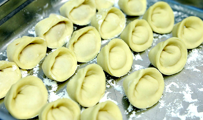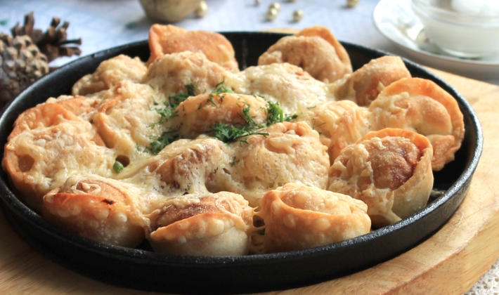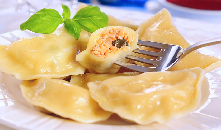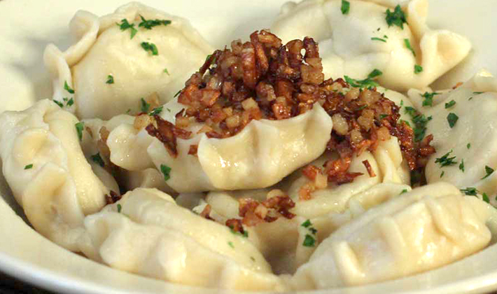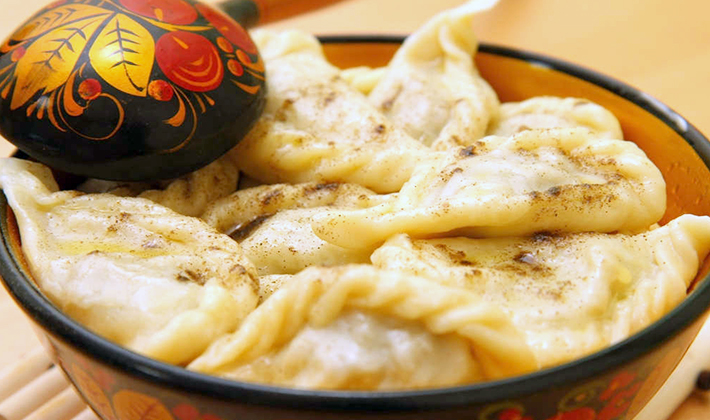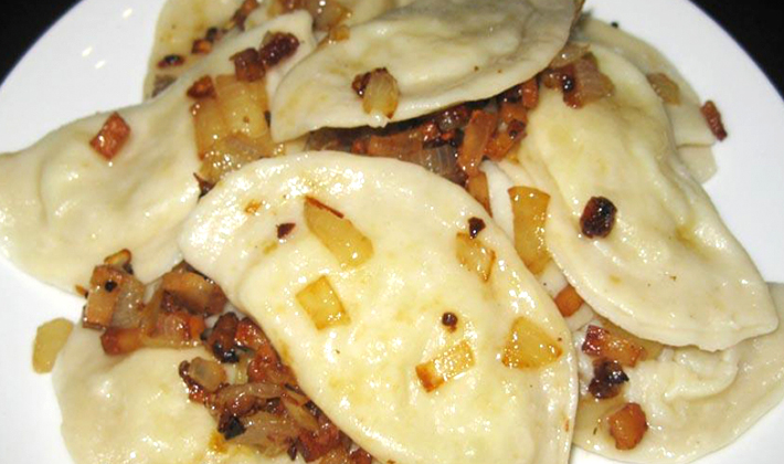 De la farine, des œufs et de l’eau, pétrir la pâte fraîche et la laisser reposer 30 minutes à température ambiante.Abaisser la pâte en une couche de 1,5 mm d'épaisseur. Étendre le fourrage sous forme de boules, espacées de 2 cm, sur toute la longueur de la pâte roulée, à 3-4 cm du bord. avec une bordure incurvée (pour le serrage). Mettre les boulettes préparées dans une rangée sur un tableau saupoudré de farine. Trempez les boulettes préparées une à une dans de l'eau bouillante salée, séparez-les soigneusement du fond de la casserole à l'aide d'une cuillère à égoutter et faites cuire pendant 6 à 8 minutes à ébullition modérée. Mettez du sel au taux de 1 cuillère à café dans 3 tasses d'eau. Au bout de 8 à 10 minutes, retirez les raviolis préparés qui ont fait surface à la surface avec une cuillère à égoutter et laissez l’eau s’égoutter. Servir saupoudré d'herbes hachées, d'huile végétale chaude et d'oignons frits. Pour le remplissage, faire bouillir les pommes de terre pelées et les réduire en purée. Faites frire les oignons avec des tranches de bacon finement hachées et frites. Ajoutez ensuite les champignons cuits et finement hachés et faites-les légèrement frire. Mélanger les champignons et les oignons avec les pommes de terre préparées, saler et poivrer le mélange.