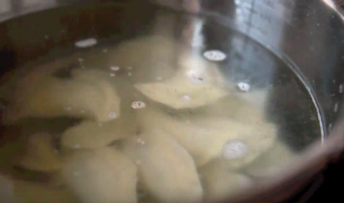 Préparer la pâte, mouler les boulettes avec les poitrines salées et les plonger dans de l'eau bouillante salée et cuire jusqu'à ce qu'elles soient cuites. Jeter dans une passoire, verser de l'eau chaude, sécher, mettre dans un bol et verser la sauce. Au lieu de la sauce, vous pouvez utiliser de l'huile végétale, dans laquelle l'oignon est frit. Les boulettes peuvent être servies chaudes ou froides. Cuisson de la viande hachée. Rincez bien les champignons dans de l'eau chaude et froide, ajoutez une petite quantité d'eau froide, laissez bouillir, réduisez le feu et laissez cuire jusqu'à cuisson complète. Versez les champignons sur une passoire et rincez-les à nouveau à l'eau froide pour qu'il ne reste plus de sable. Filtrer le bouillon dans un verre à travers une double gaze.