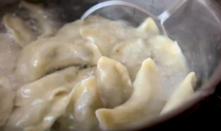 Selon cette recette, des boulettes aux poitrines crues, les champignons passés dans un hachoir à viande sont combinés avec des oignons frits. Pétrir les deux types de farine avec de l'eau et des œufs jusqu'à l'obtention d'un test uniforme et épais, puis les rouler en une couche. Couper les gâteaux, mettre la viande hachée au milieu de chacun et faire des boulettes. Les boulettes cuites bouillent dans de l'eau salée.