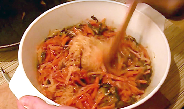 Pour la garniture, incorporer le chou haché finement dans l'huile végétale, ajouter les champignons émincés, le filet de hareng haché finement et l'oignon haché frit dans l'huile végétale