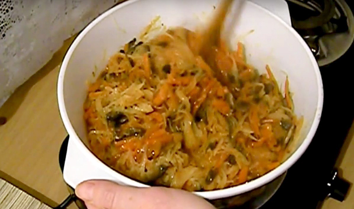 Faire bouillir les champignons, hacher, filtrer le bouillon. Hachez le chou, faites-le frire dans l'huile, mélangez-le avec des oignons émincés frits, du sel et des champignons. Pétrir la pâte, la rouler finement, découper les gâteaux, au centre desquels mettre la garniture et pincer. Faire bouillir les boulettes avec les poitrines congelées dans de l'eau salée et servir avec la sauce.