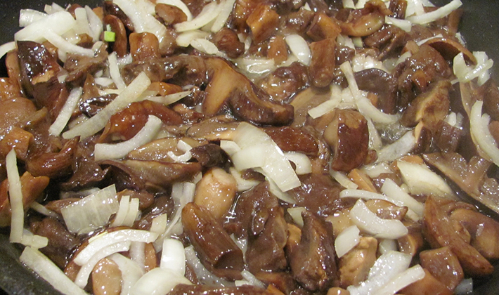 - Faire bouillir les champignons séchés pour la viande hachée, bien rincer, passer au hachoir à viande et faire frire à l'huile avec des oignons émincés.