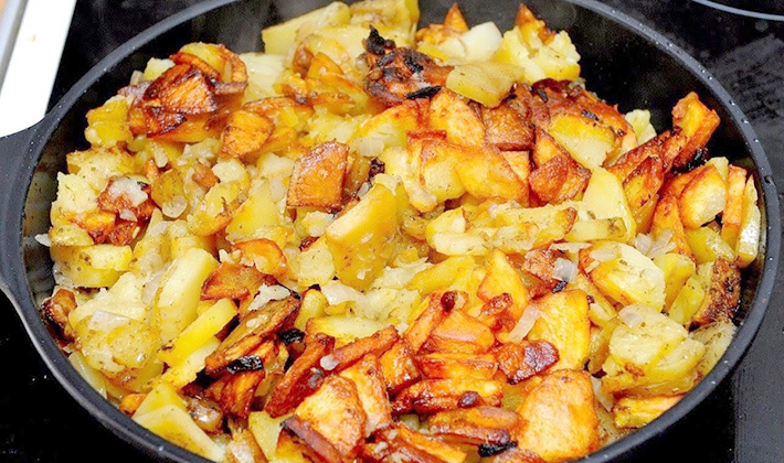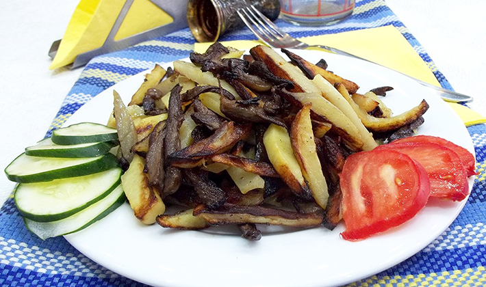 Méthode de préparation: faites bouillir les champignons pelés et hachés dans de l'eau salée, puis retirez-les, laissez l'eau s'égoutter, mettez-les dans une casserole avec la graisse chaude et faites-les frire. Épluchez les pommes de terre, lavez-les, coupez-les en tranches et faites-les griller. À la fin de la torréfaction, salez et mélangez avec les champignons et les oignons frits. Au moment de servir, vous pouvez mettre les pommes de terre frites à une extrémité du plat, les champignons sautés à l'autre et garnir de tranches d'oignons frits.