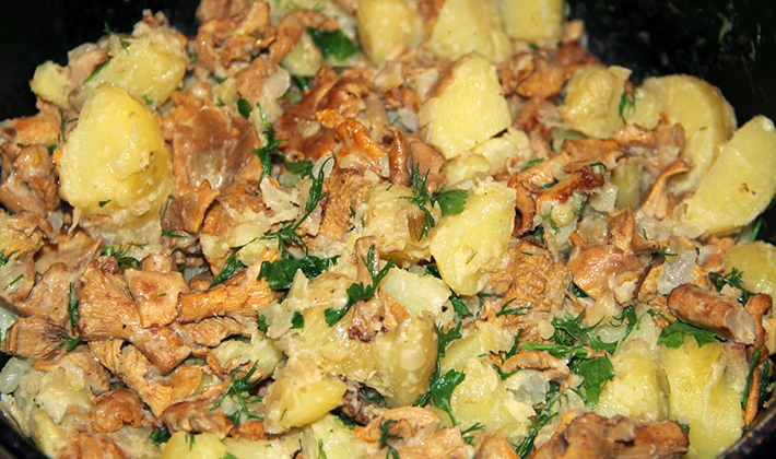 La recette de champignons sautés aux pommes de terre: coupé et lavé la récolte de racines en cubes. Versez l'huile dans la casserole et, quand il fait chaud, mettez les pommes de terre. Faites cuire environ 10 minutes de chaque côté, et réservez. Coupez les poitrines lavées en petits morceaux et faites-les mijoter dans leur propre jus légèrement salé. Dans une poêle séparée, faire revenir les oignons finement hachés; quand il est prêt, versez les champignons là-bas. Mélangez les pommes de terre avec les champignons et les oignons et laissez mijoter à feu doux pendant 7 minutes.