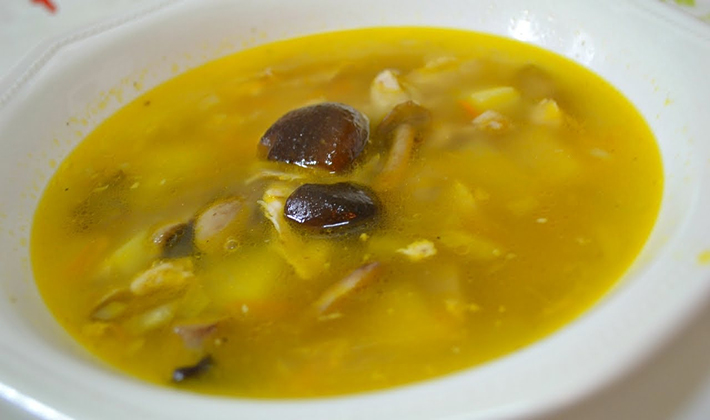 Mélanger le poisson haché, les champignons et les légumes, diluer avec le bouillon de poisson. Ajoutez la sauce blanche et faites bouillir la soupe pendant 5 à 7 minutes. Au moment de servir, mettez les champignons dans une assiette creuse, versez la soupe assaisonnée avec le mélange œuf-lait et ajoutez une tranche de beurre.