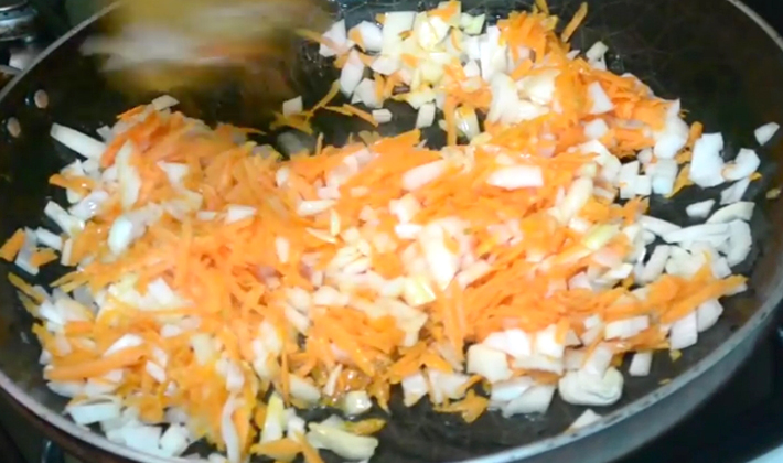 - Faire frire les carottes séparément dans de l'huile végétale, mélanger avec des oignons et verser dans la soupe.