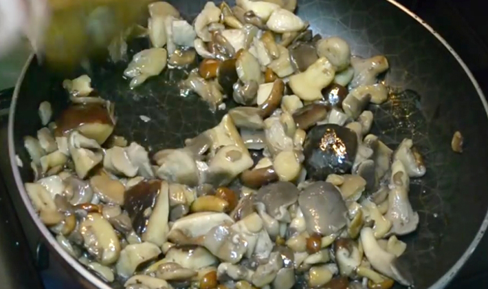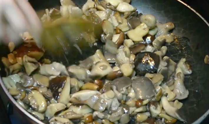 - Faire bouillir les champignons pelés, les couper en tranches et les faire revenir avec l'oignon émincé dans l'huile jusqu'à ce qu'ils soient dorés.