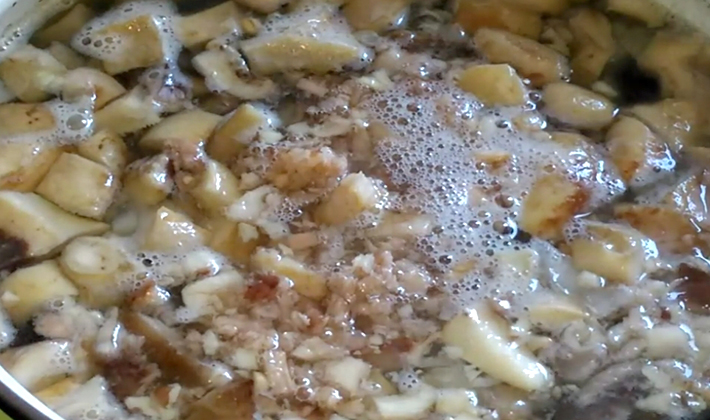- Faire bouillir les cuisses de champignon pendant 10 minutes, égoutter l'eau, ajouter du nouveau et faire bouillir encore 10 minutes.