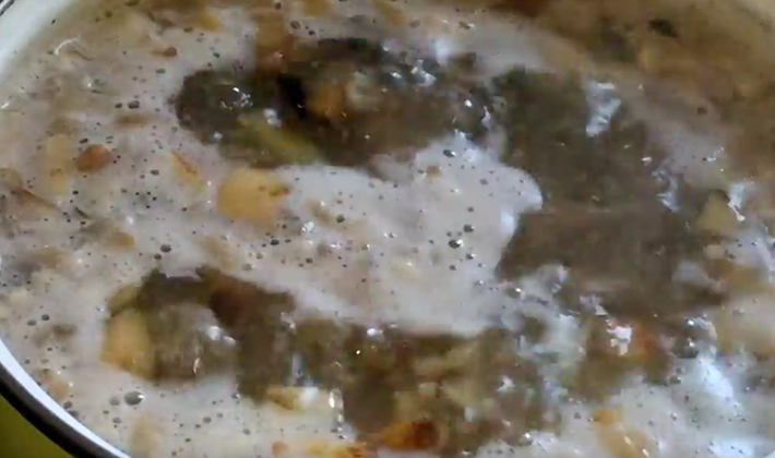 - Verser le beurre et la farine dans le bouillon de poulet bouillant, ajouter les champignons et laisser bouillir la soupe pendant 10 minutes.