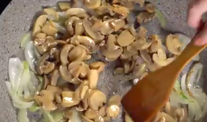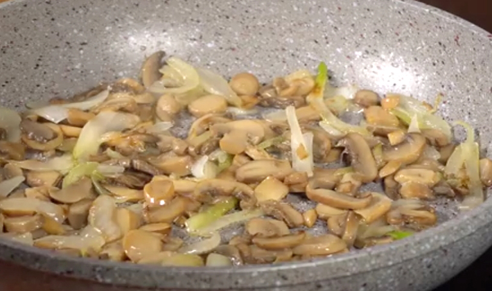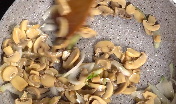 Épluchez l'oignon et coupez-le en demi-rondelles, faites-le frire dans de l'huile végétale et ajoutez-y des champignons. Les champignons donnent d'abord le jus à évaporer et ce n'est qu'alors qu'ils auront une teinte dorée.