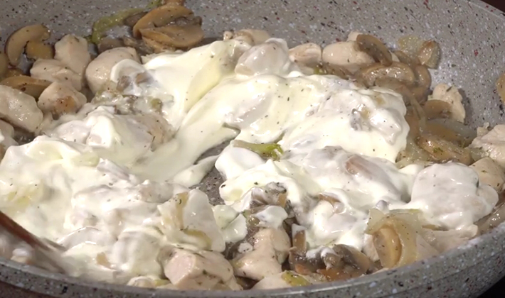 - Poulet savoureux aux champignons à la crème sure et sauce au fromage