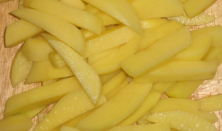 Peler les pommes de terre, les couper en lanières et verser de l'eau pendant 15 minutes.