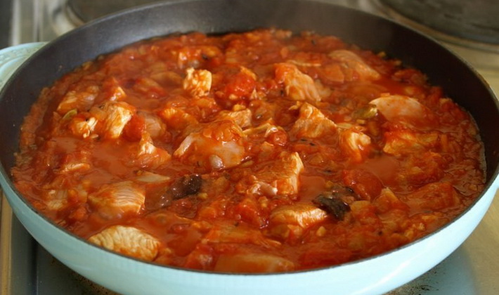 - Dans la casserole chauffée, où le plat sera cuit, le poulet est disposé.