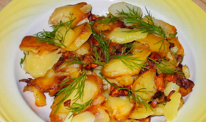 Les chanterelles fraîches frites avec des pommes de terre ont leur propre goût. De plus, ce plat est très copieux et aromatique.