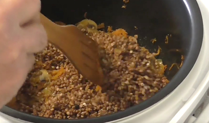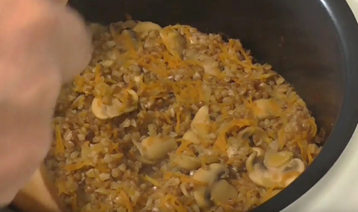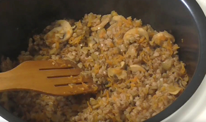 Versez le bouillon de champignons, salez au goût, mélangez et activez le mode "Sarrasin" en réglant le temps à 30 minutes.