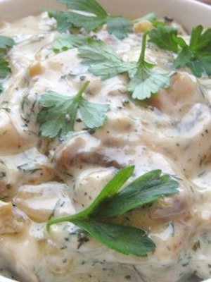 - Les champignons sont envoyés à une sauce crémeuse, la masse est mélangée jusqu'à consistance lisse.
