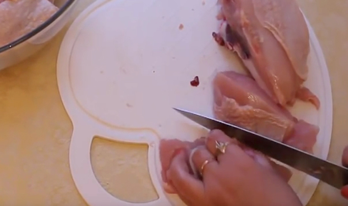- Préparez la viande: coupez en morceaux et battez avec un marteau de cuisine.