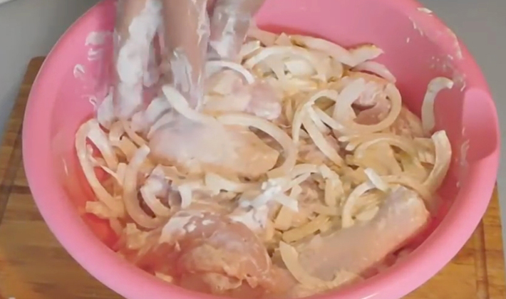 La viande et les champignons sont versés avec de la mayonnaise, mélangés et laissés à mariner pendant 40 minutes.