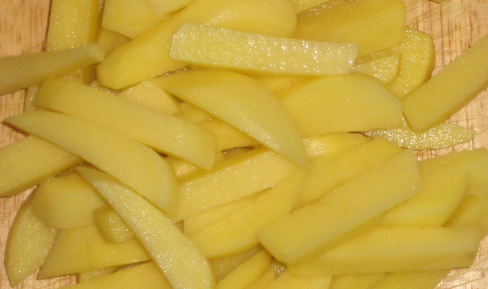 La pomme de terre est pelée, coupée en larges lanières et disposée dans une profonde plaque à pâtisserie légèrement salée.