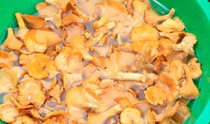 - Les girolles bouillies sont coupées en tranches et disposées dans de l'huile végétale chauffée.