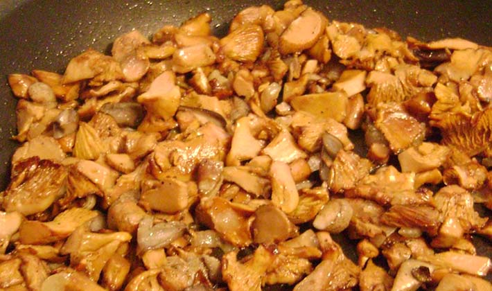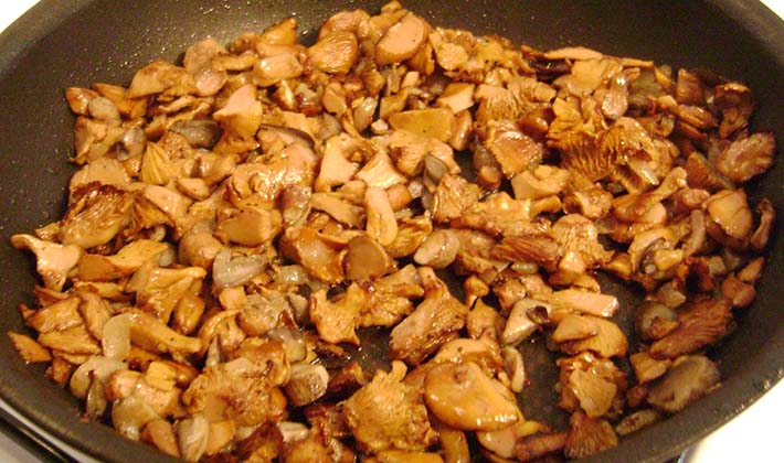- Couper les girolles bouillies en petits cubes et les faire frire jusqu'à ce qu'elles soient dorées à feu moyen.