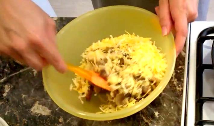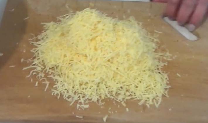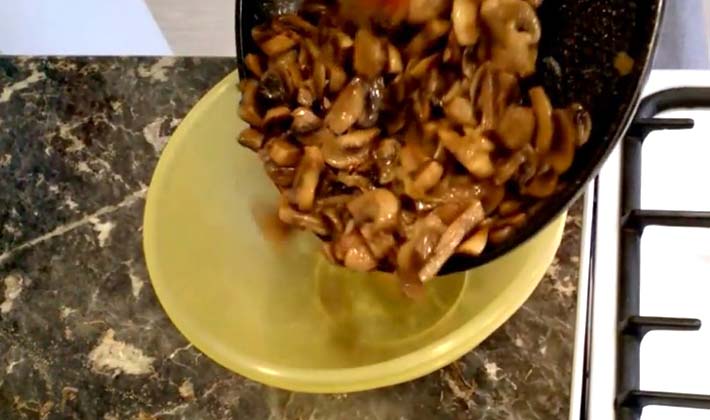 - Trois fromages sur une râpe fine et saupoudrer la masse de champignons sur le dessus.