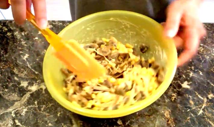 - Verser les champignons avec les oignons dans la préparation, parsemer de noisettes hachées et mettre au four chaud.
