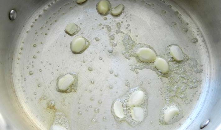 - L'ail coupé en dés est ajouté et rôti pendant 10 minutes. à feu vif.