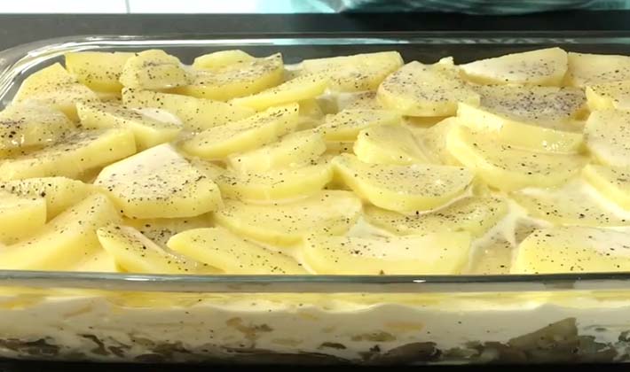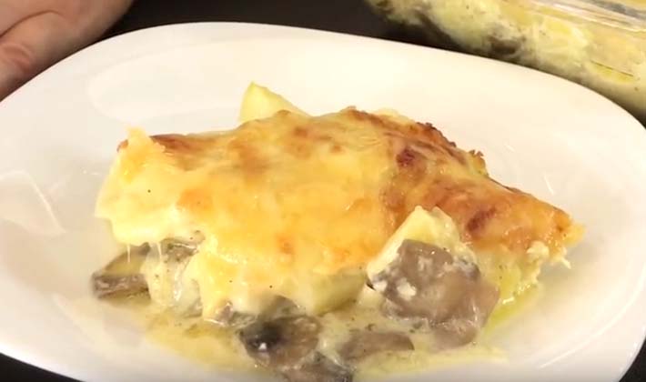 Dans une forme résistante à la chaleur, mettre des cercles de pommes de terre, puis une couche de champignons avec des oignons et verser la sauce au fromage.