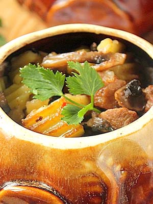 - Un plat de girolles à la viande cuite dans des pots