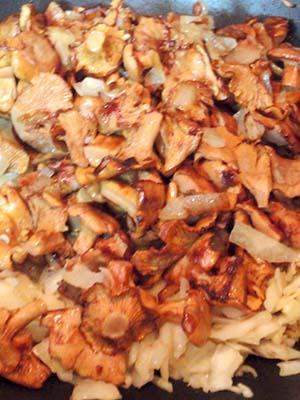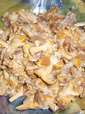 - Couper les girolles en morceaux, les faire revenir dans une casserole avec de l'huile végétale avec des demi-rondelles d'oignon et des dés d'ail jusqu'à ce que le liquide s'évapore.