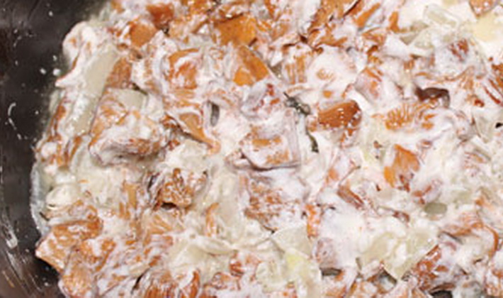 Des girolles hachées sont ajoutées, de la crème sure, de la pâte de tomates sont ajoutées et mélangées.
