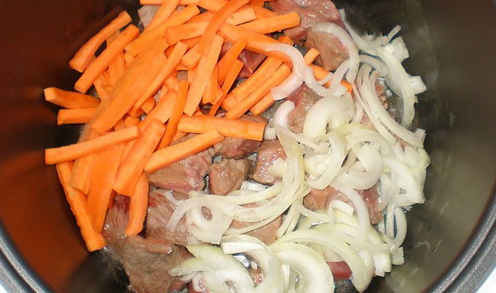 Les oignons sont coupés en cubes, les carottes sont frottées sur une râpe et tout est disposé pour la viande.Elle est frite dans le même mode pendant encore 10 minutes.