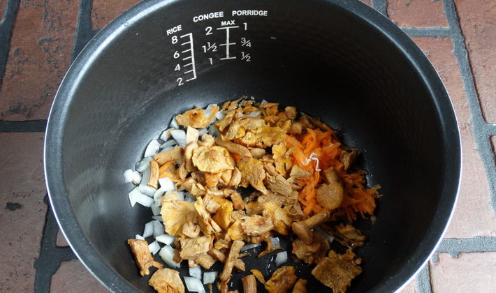 - Versez un peu d'huile dans le bol multicuiseur, activez le mode “Frying” (friture) pendant 20 minutes. et verser dans les chanterelles.