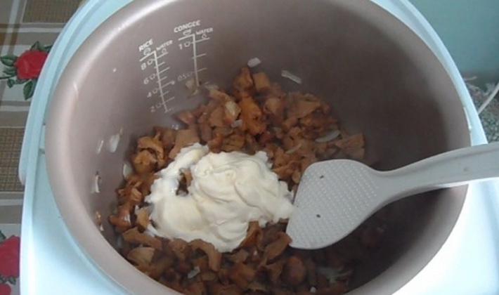La recette pour la cuisson des girolles à la crème sure dans une mijoteuse est décrite par étapes: