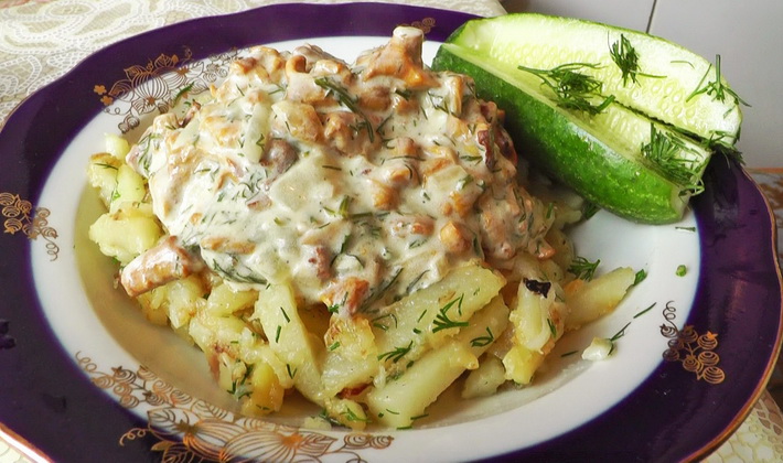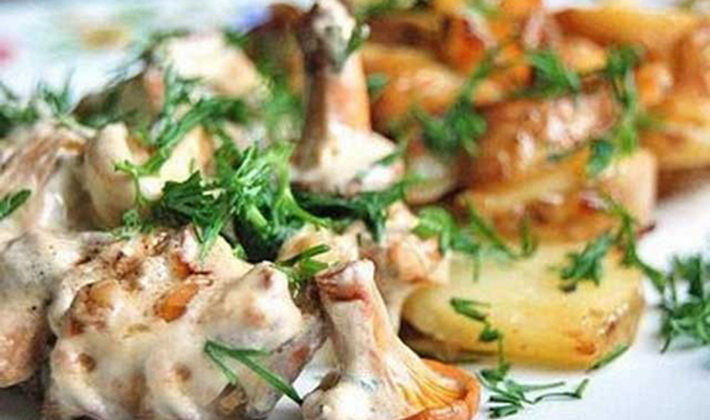 - De délicieuses pommes de terre aux girolles et à la mayonnaise se marieront bien avec de la viande frite, ainsi qu'une salade de légumes frais ou de concombres en conserve.