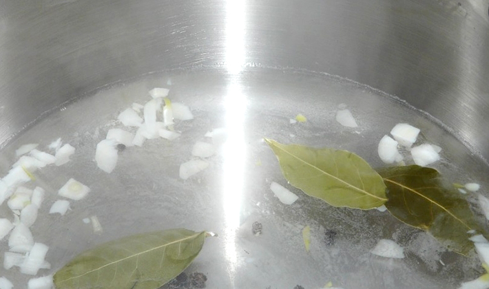 Versez de l'eau dans la casserole, laissez bouillir, ajoutez 1 c. sel et feuille de laurier.