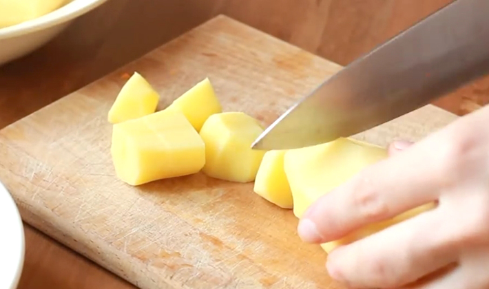 - Épluchez les pommes de terre, coupez-les en petits cubes, remplissez-les d'eau et mettez-les au feu.