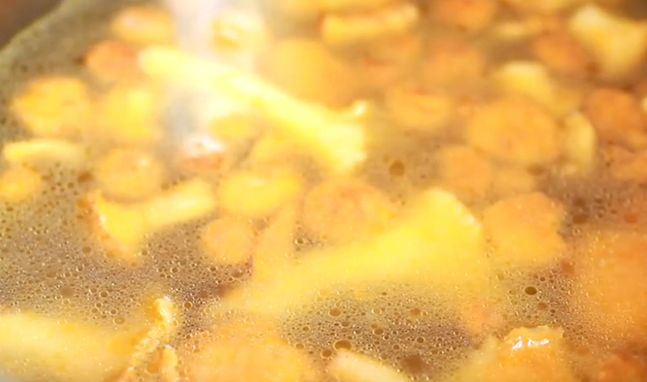 - La masse obtenue est mélangée et frite pendant 15 minutes. à feu moyen.