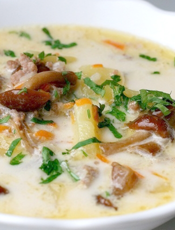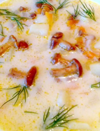 La soupe de girolles au fromage à la crème est une excellente option pour un plat délicat et parfumé pour toute la famille. Il ne devrait être consommé que sous forme chaude avec de l'aneth ou du persil hachés.