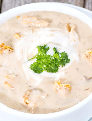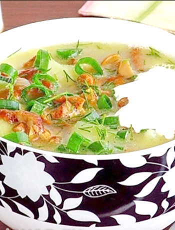 Velouté de girolles à la crème, à la texture délicate et au goût crémeux, rien de plus appétissant et aromatique. Vous pouvez décorer la soupe avec des champignons entiers frits ou des croûtons de pain brun.