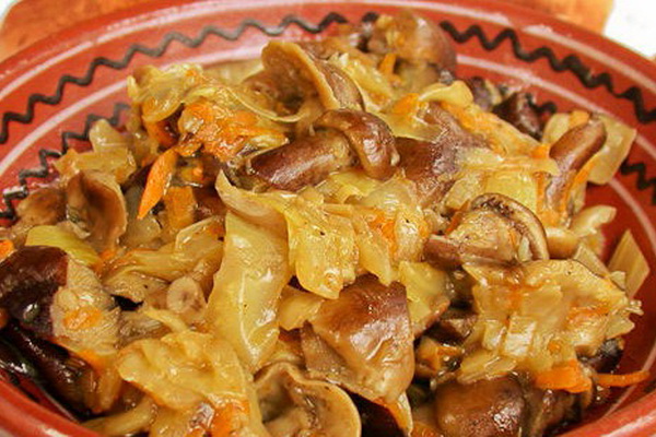 Faire sauter les oignons hachés dans une casserole, les mélanger avec les champignons, puis les envoyer ensemble au chou. Cuire le méli-mélo pendant 15 minutes à feu doux, mettre dans des bocaux et couvrir avec des couvercles.
