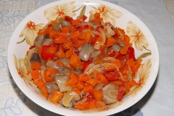 Séparément, dans une casserole profonde, faire revenir le chou légèrement en ajoutant un peu d'huile de tournesol. Mélanger avec les carottes, les oignons, les tomates et les champignons.