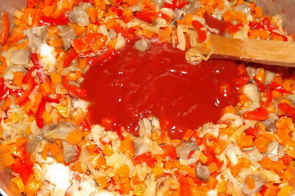 Mélanger le poivre avec les huiles et les oignons, verser la pâte de tomate diluée dans de l’eau. Mélangez bien la masse et laissez mijoter à feu doux pendant environ une demi-heure.