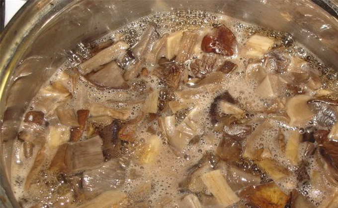 Nous nettoyons les champignons de la saleté, rincons et faisons bouillir pendant 20 minutes dans de l'eau salée. Jetons-le dans une passoire et laissez l'excès de liquide s'écouler.