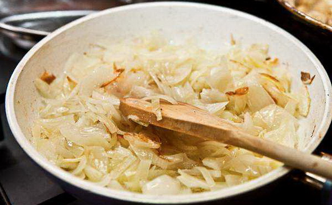 Pendant que l'eau s'égoutte, épluchez les oignons, coupez-les en cubes et faites-les frire dans l'huile végétale jusqu'à ce qu'ils soient tendres.