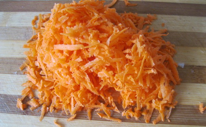 Peler les carottes, laver sous le robinet et râper. Ajouter à l'oignon et faire frire jusqu'à coloration dorée.