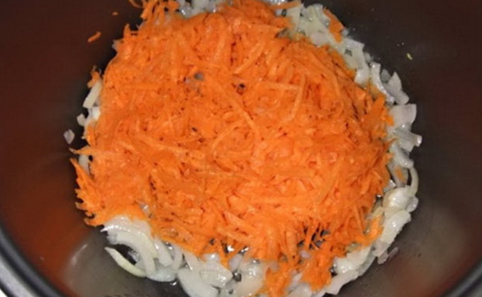 Les oignons et les carottes sont pelés, coupés en cubes et frits à la mijoteuse dans de l'huile végétale pendant 10 minutes en mode "Friture".